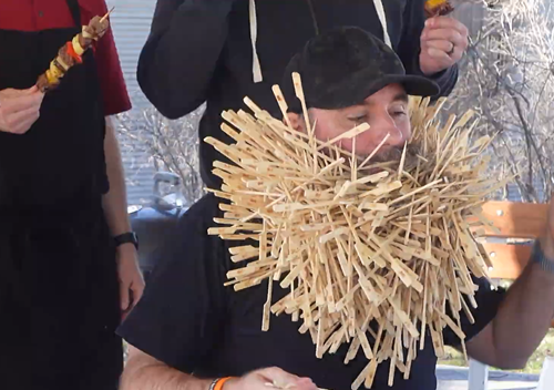 玩到最后他整整在胡子上挂了602根烧烤签子,满脸都是刺儿,豪猪看了都自愧不如。这要是摔一跤,不知道会有多痛。