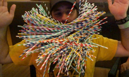 2020年他突发奇想,玩起了纸吸管,在胡子里塞了534根。